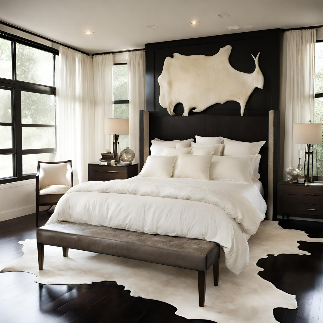 Break up straight lines with an organic cowhide. Style the coffee table with the Thirds Rule. Add a lantern pair to the hearth and leafy greenery to the console for quiet movement.