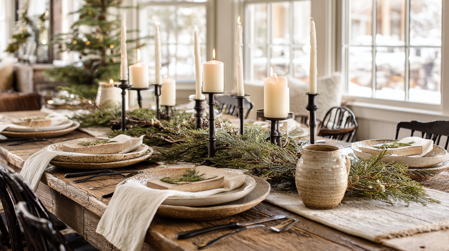 Keep the centerpiece low and linear. A long dough bowl with candle holders and a fern reads warm but practical. Clear table ends for serving so style never fights function.