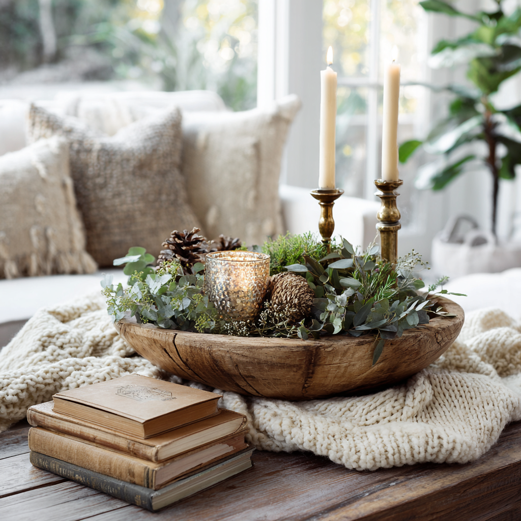Begin with a vintage-style piece you love, maybe a wooden dough bowl that carries a bit of history. Add in modern pieces with clean edges so the look feels collected, not crowded.
