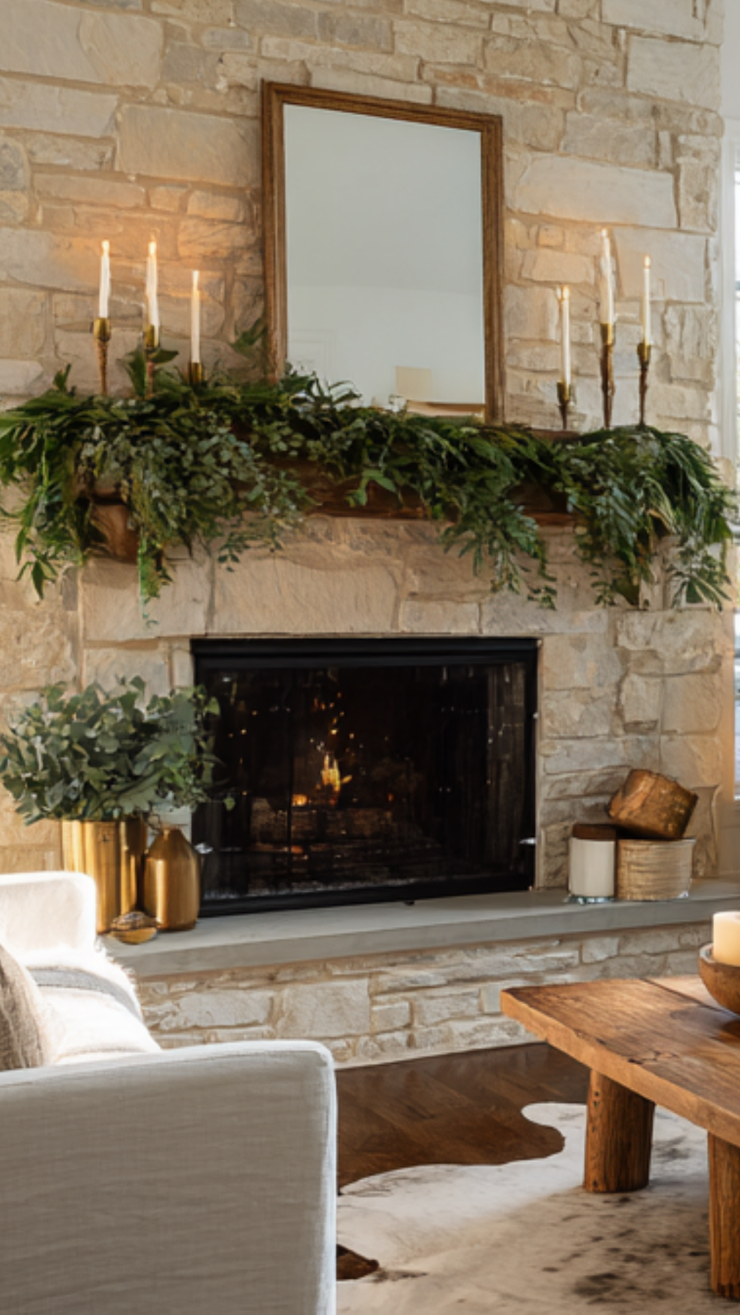 Fewer, larger accents; mirrors to bounce warm light; slim lanterns; low greenery. Keep surfaces 1/3 open.