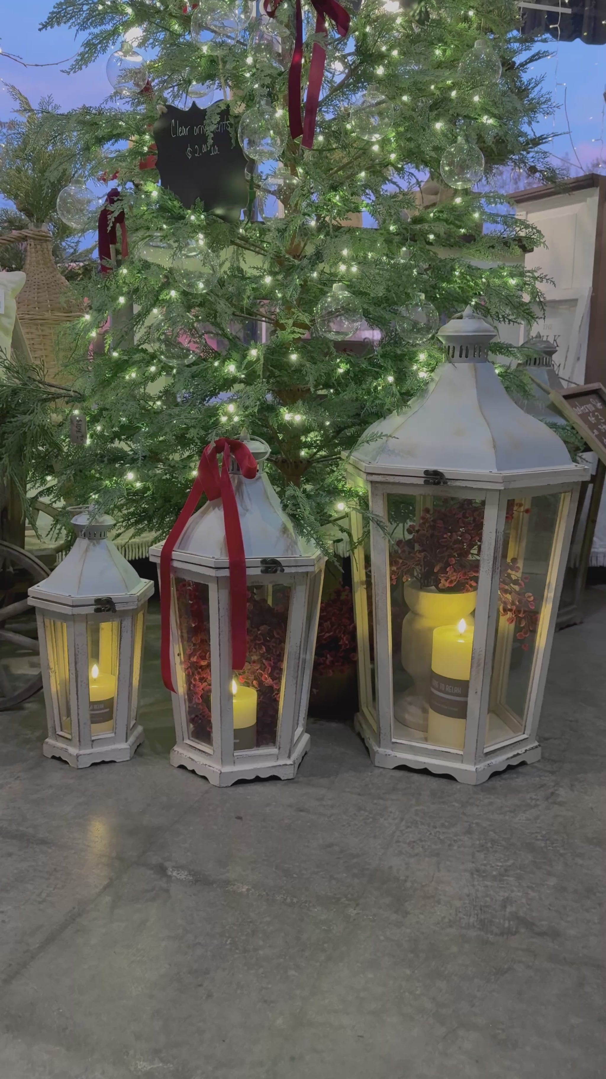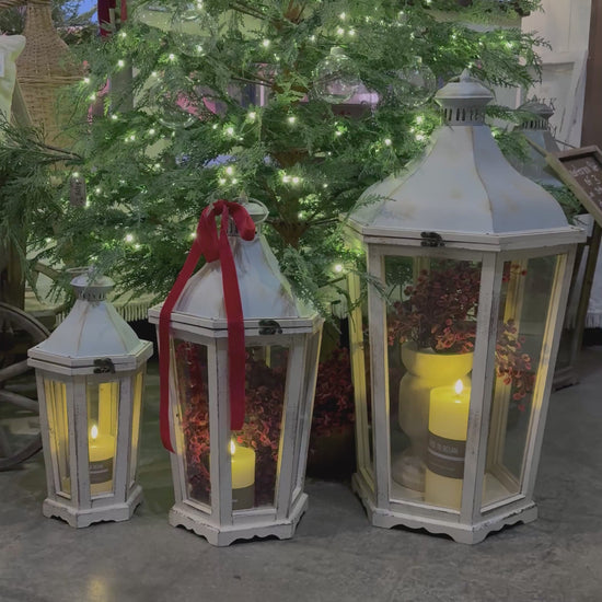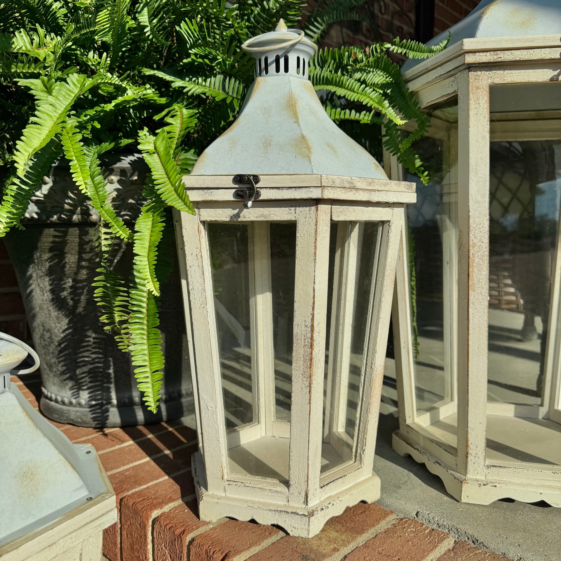 This Large Rustic White Lantern set is a true statement for modern rustic homes. Crafted from distressed white wood with softly aged metal tops, each lantern carries a timeless charm that feels collected and storied. Their tall, graceful shapes and weathered finish make them just as striking styled together as they are individually.