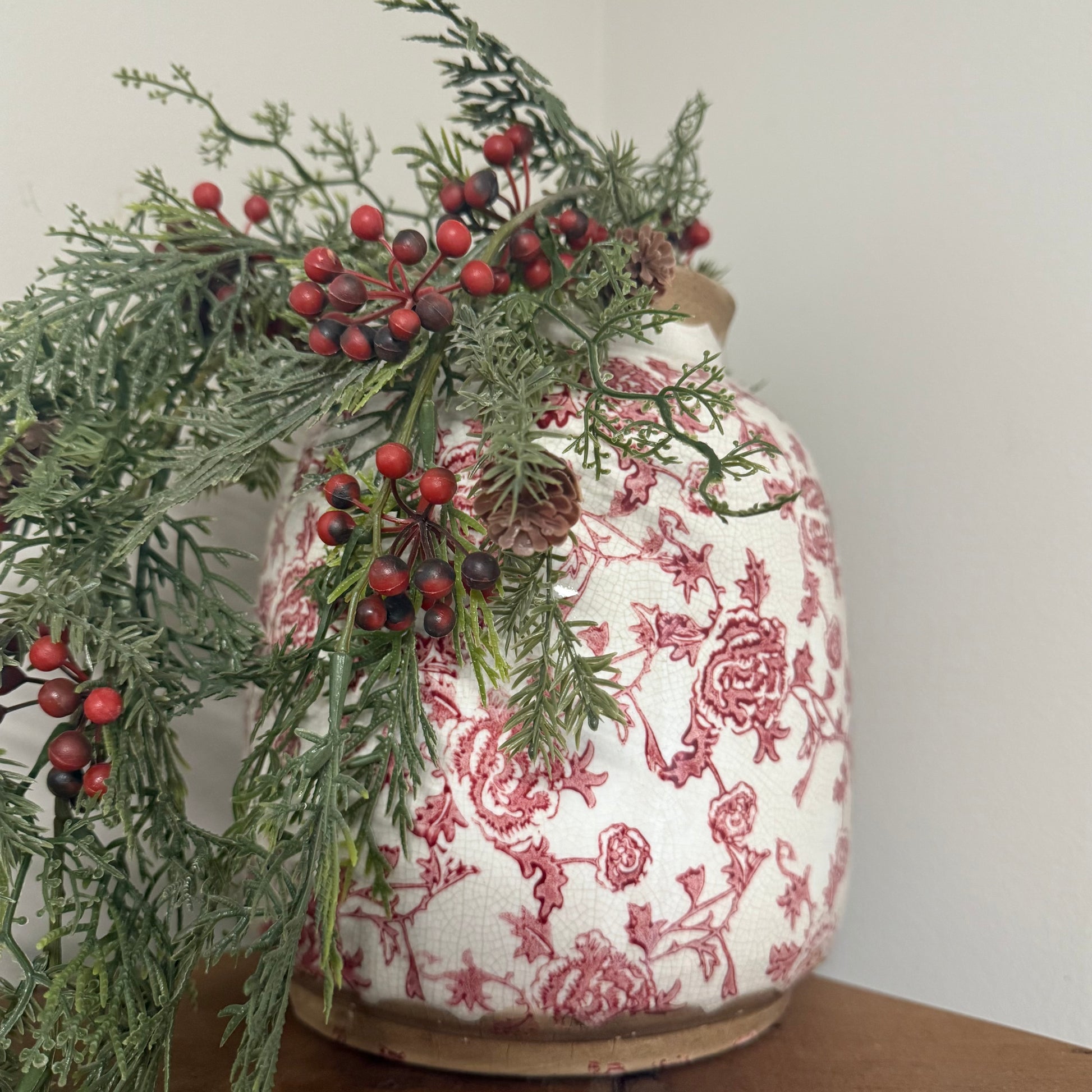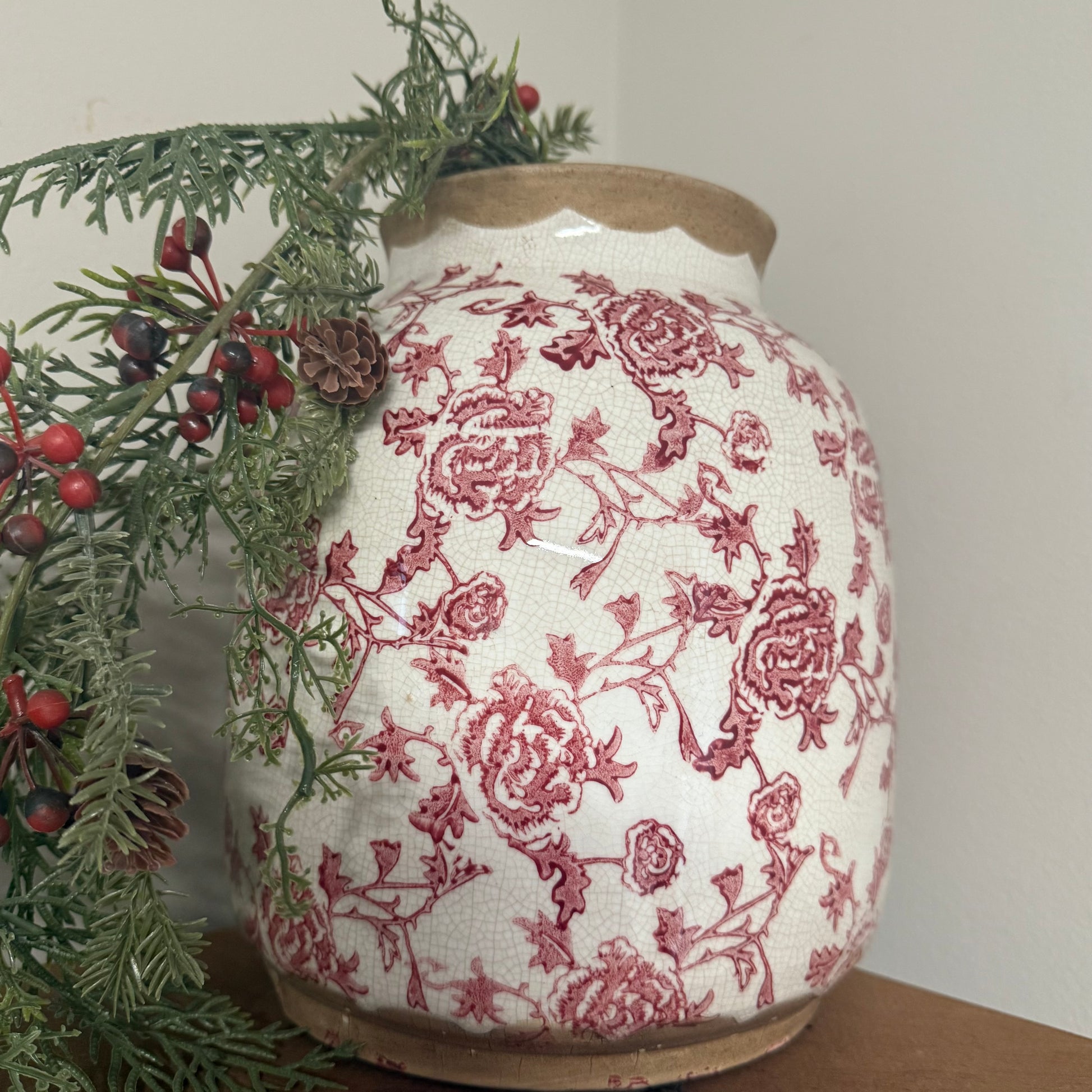 A rich red heritage vase that feels classic and timeless. Just add simple greenery or bare branches for an easy statement and change out each season. Vintage style details for rustic home decor lovers. Vase is perfectly imperfect.
