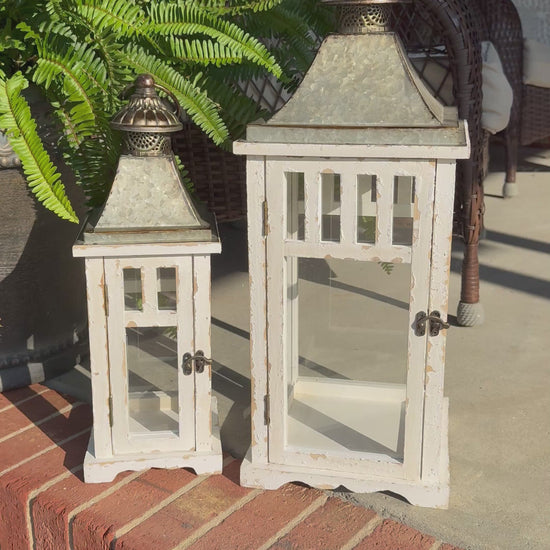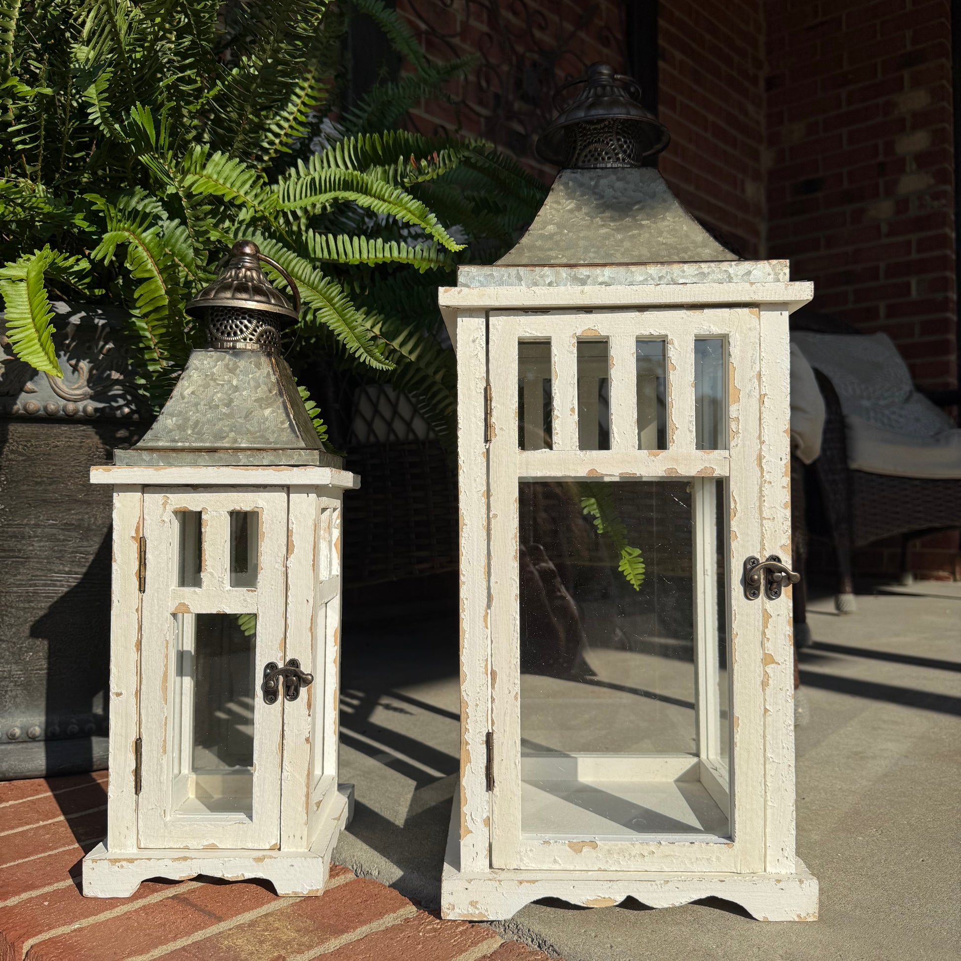 Two lanterns, one timeless look. This pair is crafted from distressed white wood with zinc tops, giving them the perfect balance of rustic charm and classic detail. The tall windows let the light spill through beautifully, whether you add a flickering candle or tuck in a bit of greenery. This set is closed with glass.