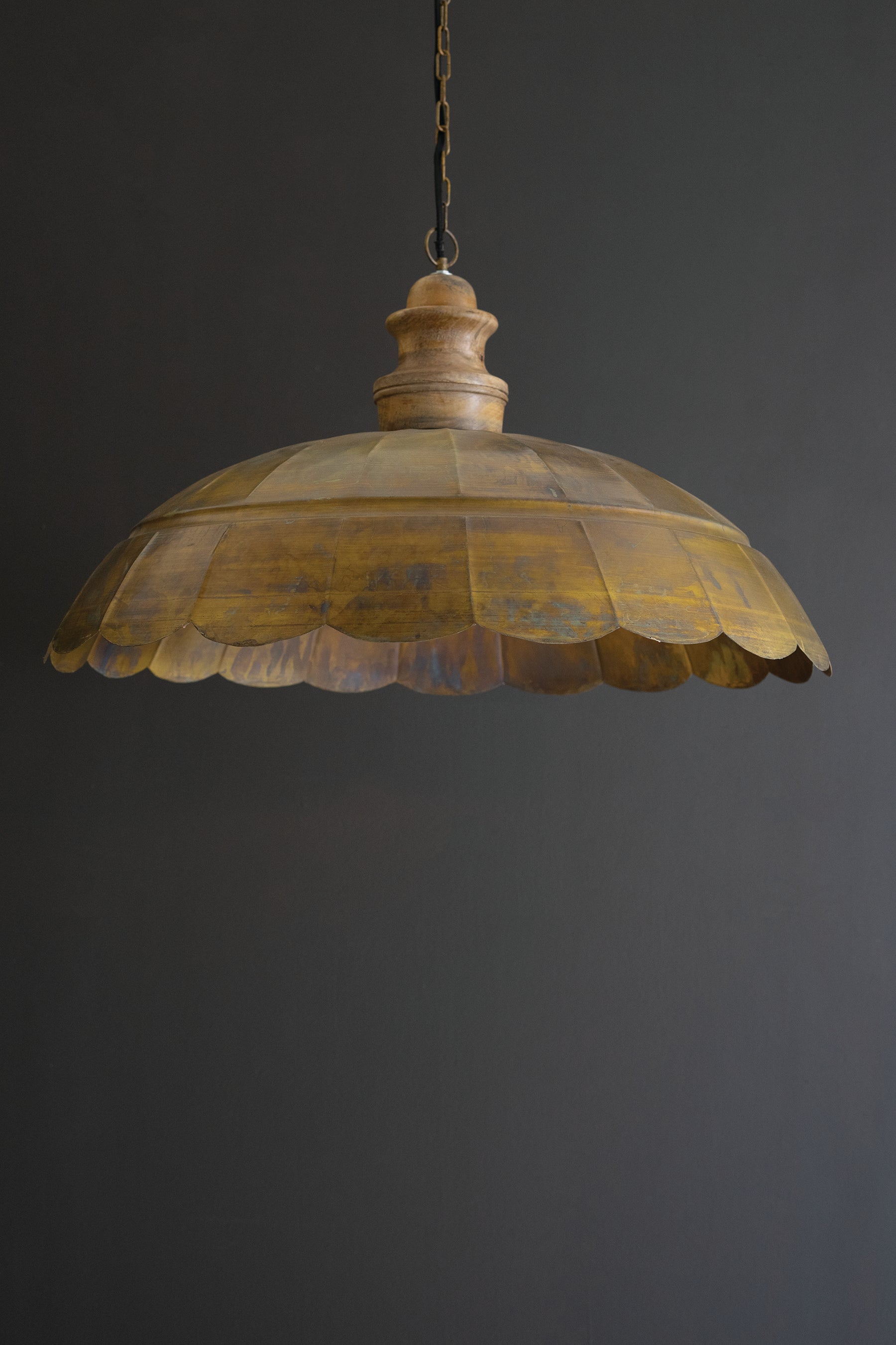 Our Antique Brass Come Pendant Light with Wood Detail marries timeless elegance with rustic warmth. The pendant has a beautiful scalloped dome in aged brass and natural wood creaing an inviting focal point, for your space.